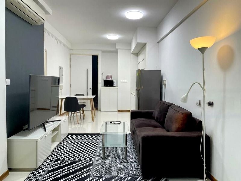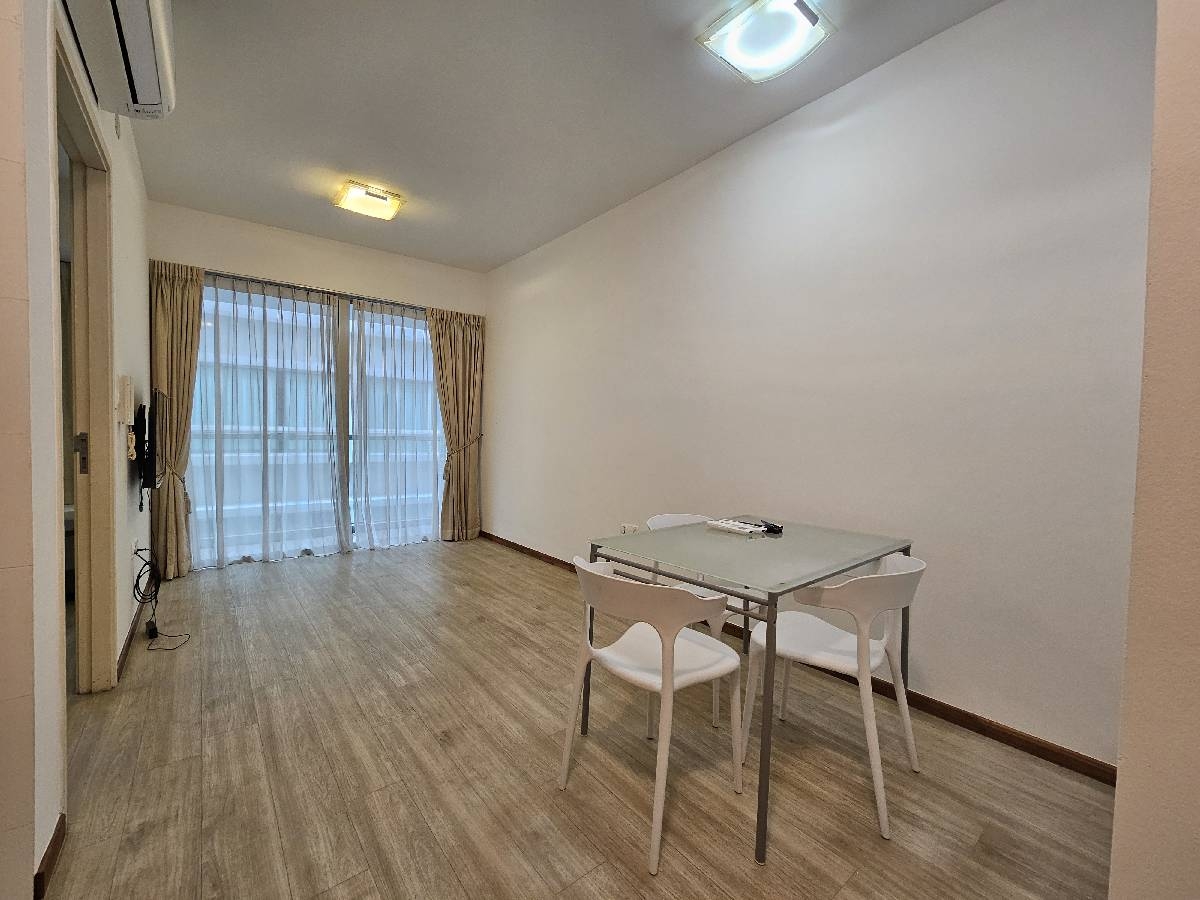 Step into a serene oasis at PARC SOPHIA, where abundant natural light floods the open-concept living space, accentuating the modern minimalist design. The floor-to-ceiling curtains frame views of neighboring buildings, creating a tranquil urban retreat. The laminate flooring adds a touch of warmth, while the sleek finishes invite you to unwind in style.