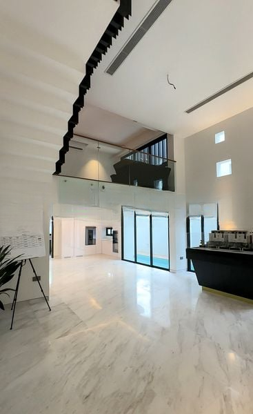 Step into a world of modern elegance as you enter this brand-new designer home, where abundant natural light floods the open-concept living area, accentuating the stunning white marble flooring and double-volume ceiling. Floor-to-ceiling glass doors invite the outside in, offering breathtaking views of the pool, city skyline, and lush greenery, creating an ambiance that is both tranquil and luxurious.