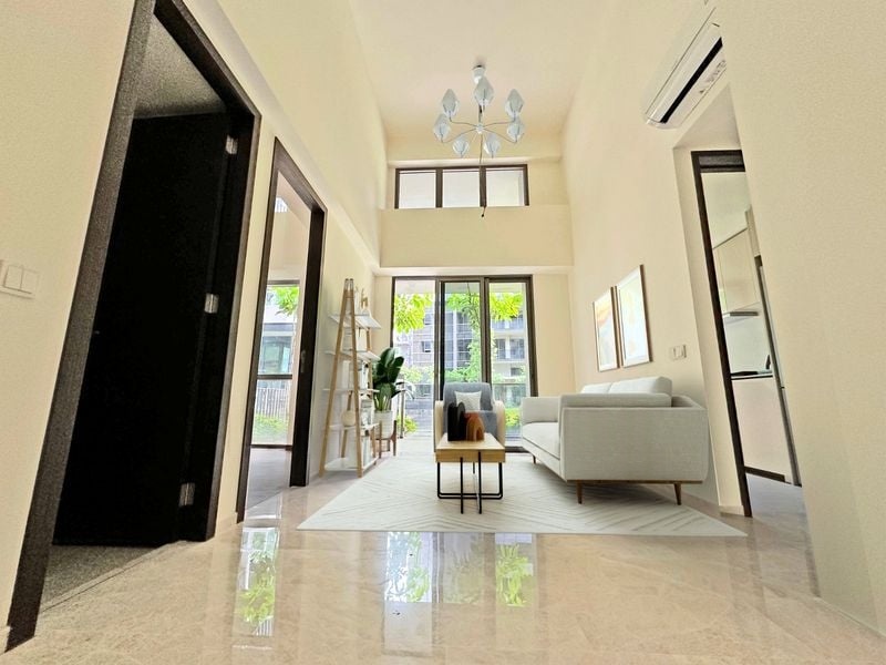 Step into a sanctuary of modern elegance at Daintree Residence, where polished marble flooring greets you with a sense of luxury. The abundant natural light floods the living area through floor-to-ceiling windows, creating an airy ambiance that connects seamlessly to a private balcony overlooking lush greenery. The minimalist design invites tranquility, making it a perfect retreat from the bustling city.