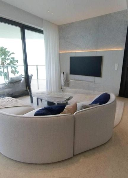 This spacious 4-bedroom, 4-bathroom unit boasts standout features including a curved modular sofa, an oval marble dining table, and a luxurious dark marble bathroom. Each bedroom is thoughtfully designed with a floating bed, integrated headboard lighting, and wall-mounted reading lights, ensuring comfort and style. The seamless flow from the living area to the balcony invites you to enjoy outdoor living at its finest.
