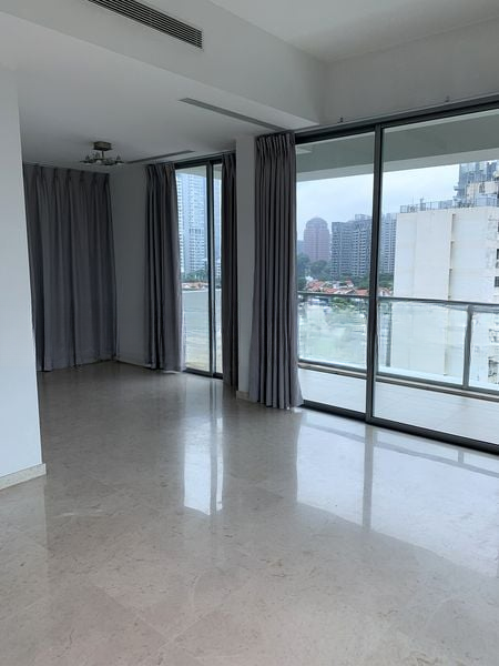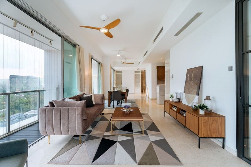 Step into a world of luxury as you enter this stunning designer unit at One Tree Hill Residence. Bathed in natural light, the expansive living area features floor-to-ceiling windows that frame breathtaking panoramic views of the city skyline, pool, and lush greenery. The ambiance is bright and airy, enhanced by polished marble flooring and modern minimalist furnishings that invite relaxation and sophistication.