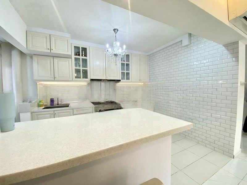 This well-maintained unit features an L-shaped kitchen with sleek light wood lower cabinets and pristine white upper cabinets, perfect for culinary enthusiasts. The large living room, adorned with a comfortable leather sofa and stylish patterned rug, offers a perfect spot for relaxation. The master bedroom boasts a sliding wardrobe with textured glass, enhancing the room's elegance, while the bathroom features contemporary finishes with a convenient handheld shower.