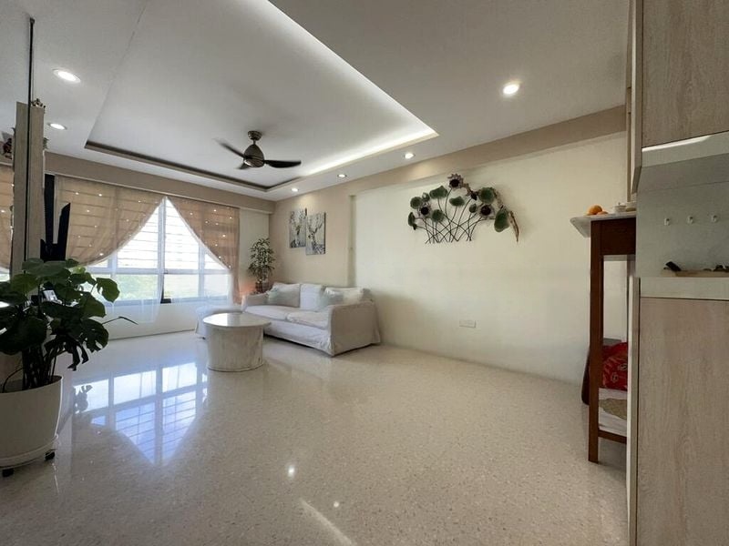 Step into a bright and airy sanctuary at Edgedale Plains, where abundant natural light floods the open-concept living room, highlighting the polished stone flooring and elegant false ceiling with cove lighting. Large windows frame picturesque views of lush greenery, creating a serene ambiance that invites relaxation.