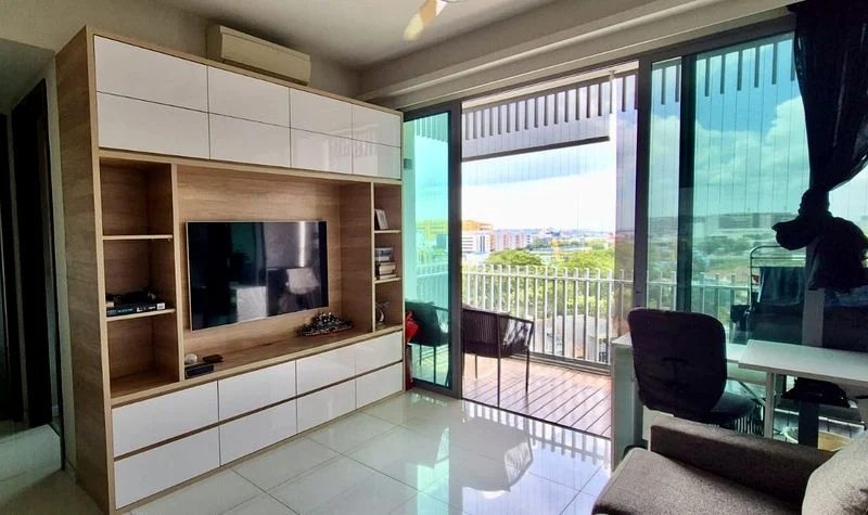 Step into a beautifully renovated 2-bedroom unit at Hundred Trees, where abundant natural light floods the open-concept living space, creating a warm and inviting ambiance. The modern finishes, including a concrete-look feature wall and a stylish built-in TV console, perfectly complement the serene views of the cityscape and lush greenery from the balcony, which features elegant wooden decking.