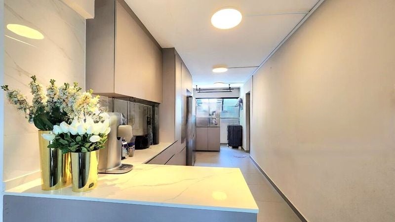Step into a world of modern elegance as you enter this beautifully renovated HDB flat. Bathed in abundant natural light, the open-concept living and dining area features stunning wood-look flooring and a striking marble-look TV feature wall, creating a warm yet sophisticated ambiance. Enjoy panoramic views of the greenery, sports stadium, and city skyline from your private balcony, making every moment at home a visual delight.