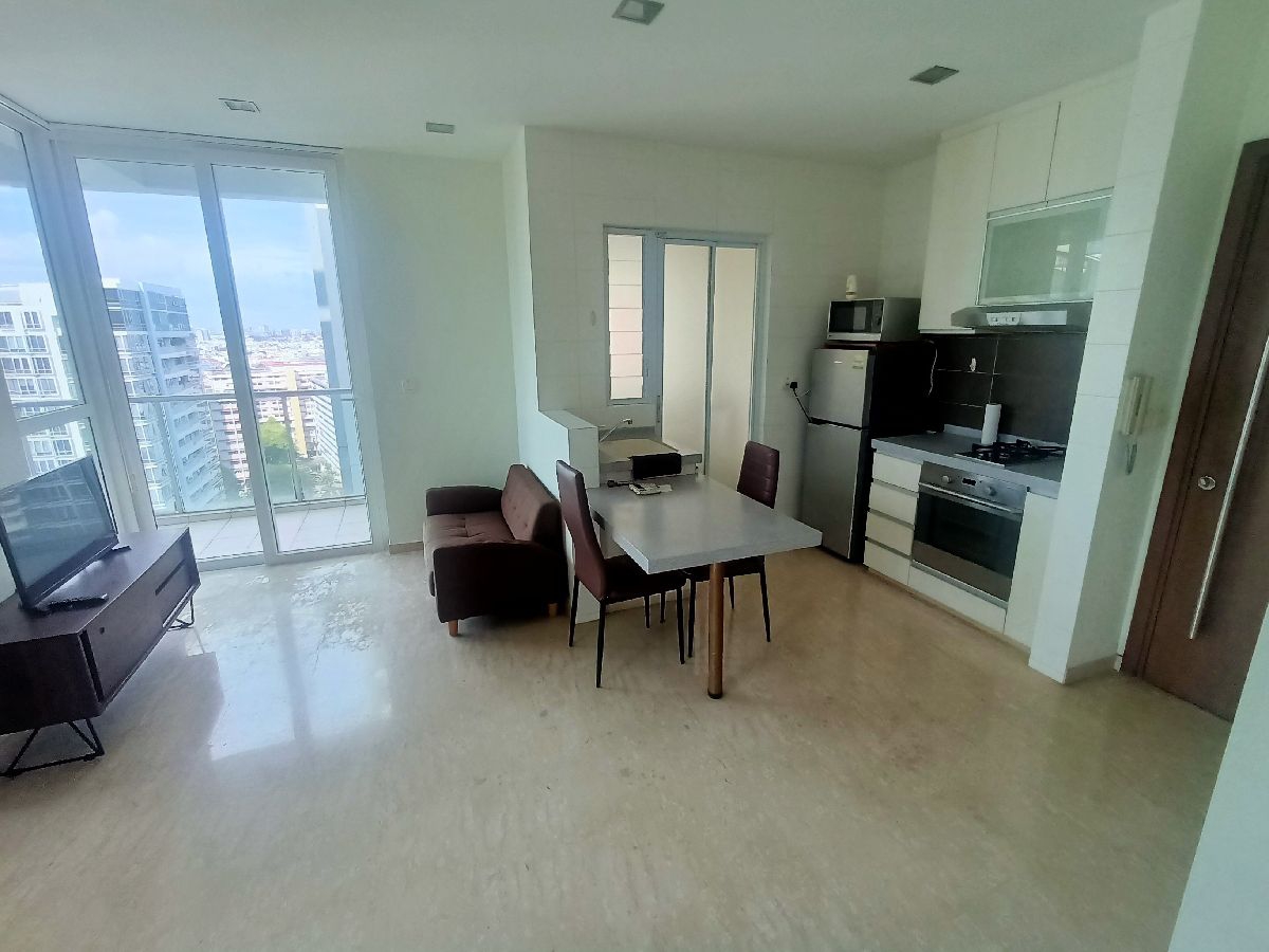 This efficient 452 sqft layout features a fully-furnished living room with a wall-mounted TV and a cozy dining area. The kitchenette is equipped with a built-in oven, gas hob, and frosted glass cabinets, seamlessly blending functionality and style. The bedroom boasts floor-to-ceiling windows adorned with dark blackout curtains, while the bathroom impresses with a mosaic tile shower and sleek fixtures. Enjoy the convenience of a resident gym equipped with cardio machines and a multi-gym station.