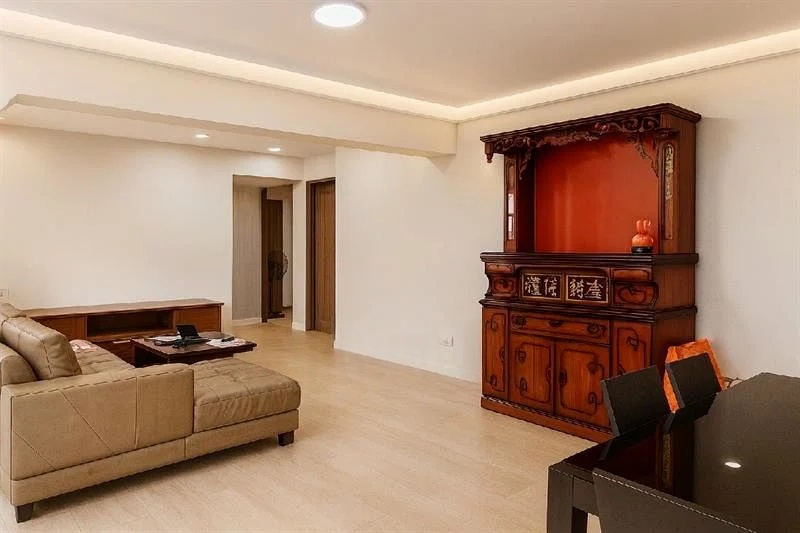 Step into this well-maintained 3-bedroom flat and be greeted by a warm ambiance, enhanced by modern finishes and thoughtful design. The living room features a striking TV console and integrated display cabinet, complemented by recessed lighting that creates an inviting atmosphere. Natural light flows through the unit, accentuating the tiled flooring and functional layout.