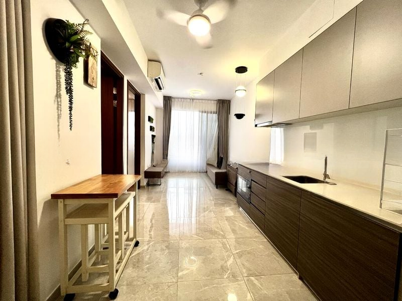 Step into a world of elegance and sophistication in this brand-new 3-bedroom unit at Stirling Residences. The moment you enter, you are greeted by abundant natural light pouring through the floor-to-ceiling glass sliding doors, illuminating the polished marble flooring of the spacious living area. The breathtaking views of the city skyline and distant sea create an inviting ambiance, making this home a perfect sanctuary.