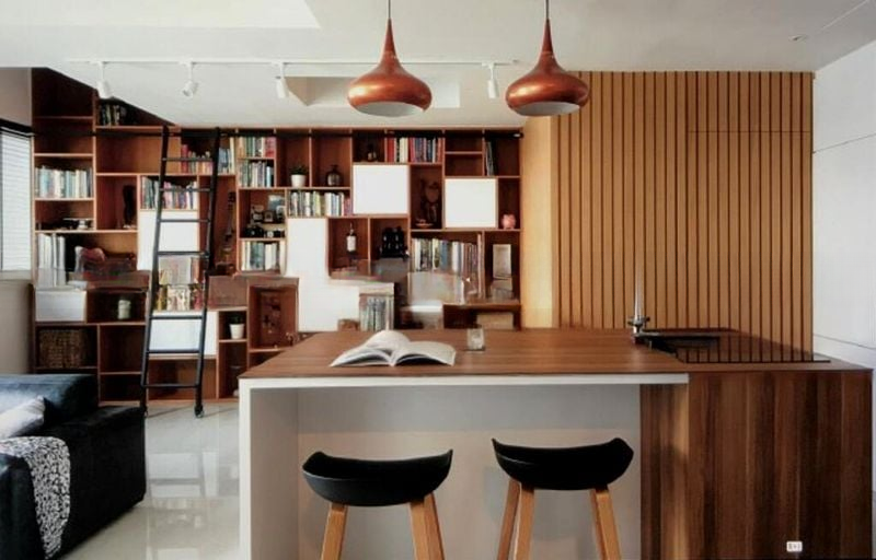This spacious 4-bedroom unit boasts a thoughtful layout, featuring a stunning island kitchen with a wooden countertop, perfect for culinary enthusiasts. The living room is a blend of style and functionality, complemented by a sleek wooden slatted TV console. A unique study/library area with a floor-to-ceiling bookshelf and rolling ladder adds a touch of charm, while the full-height built-in wardrobes in the bedrooms provide ample storage without compromising on style.
