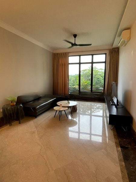 Step into a sanctuary of light and elegance at The Sterling, where abundant natural light floods the spacious living area, accentuating the polished marble flooring with its striking dark borders. The ambiance is bright and airy, enhanced by ornate chandeliers and large floor-to-ceiling windows draped in gold curtains, offering serene views of lush greenery that invite the outdoors in.