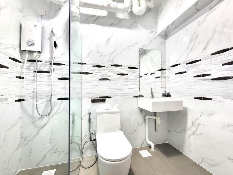 Step into this bright and airy 3-bedroom flat, where light grey wood-look laminate flooring and glossy white tiles create a welcoming ambiance. The well-maintained interiors are complemented by recessed ceiling lights, enhancing the spacious feel as you walk through the hallway and into the living area, where built-in shelving offers both style and functionality.