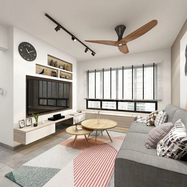 The L-shaped kitchen features dual-tone cabinetry and a stainless steel hood, perfect for culinary enthusiasts. Each bedroom is thoughtfully designed with built-in open shelving and window grilles, ensuring both practicality and security. With a total floor area of 1184 sqft, this unit provides ample space for comfortable living.