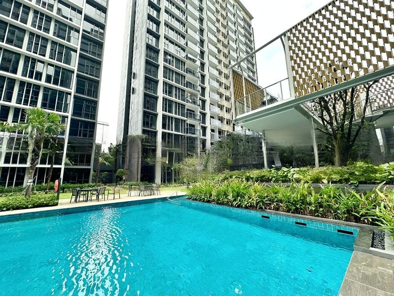Step into this brand-new, modern minimalist condo at PENROSE and be captivated by the abundant natural light pouring through the floor-to-ceiling windows. The polished tile flooring reflects the vibrant city skyline, while the serene views of greenery and the pool create a perfect urban oasis. You’ll feel an immediate sense of tranquility and sophistication as you enter this beautifully designed space.