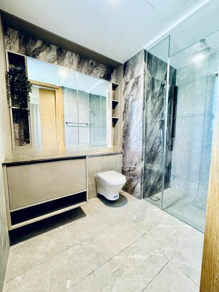 This spacious 3-bedroom unit features an L-shaped kitchen equipped with a built-in oven and gas hob, ideal for culinary enthusiasts. The living room, with its sleek finishes and sliding doors, seamlessly connects to a private balcony, perfect for enjoying your morning coffee. The master bedroom boasts large windows offering stunning city views, while the bathrooms are adorned with marble-look tiles and a luxurious rain shower, ensuring a spa-like experience at home.