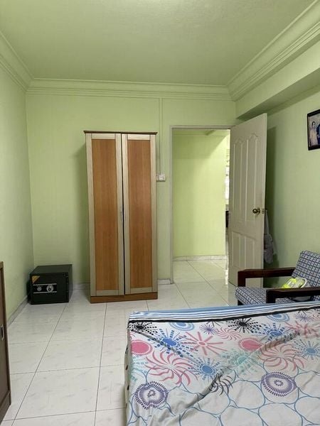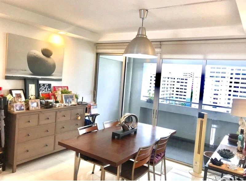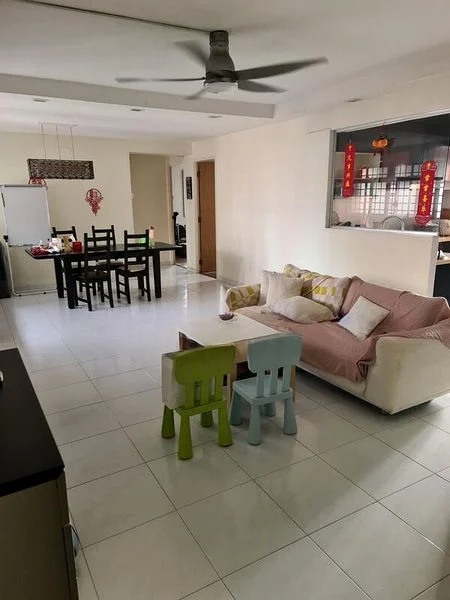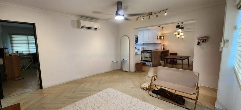 Step into a warm and inviting ambiance as you enter this beautifully renovated HDB flat. The cozy living room features an eye-catching orange accent wall complemented by herringbone wood-look flooring and designer pendant lighting, creating a perfect space for relaxation. Natural light filters through the zebra blinds, enhancing the urban views that greet you from every corner.