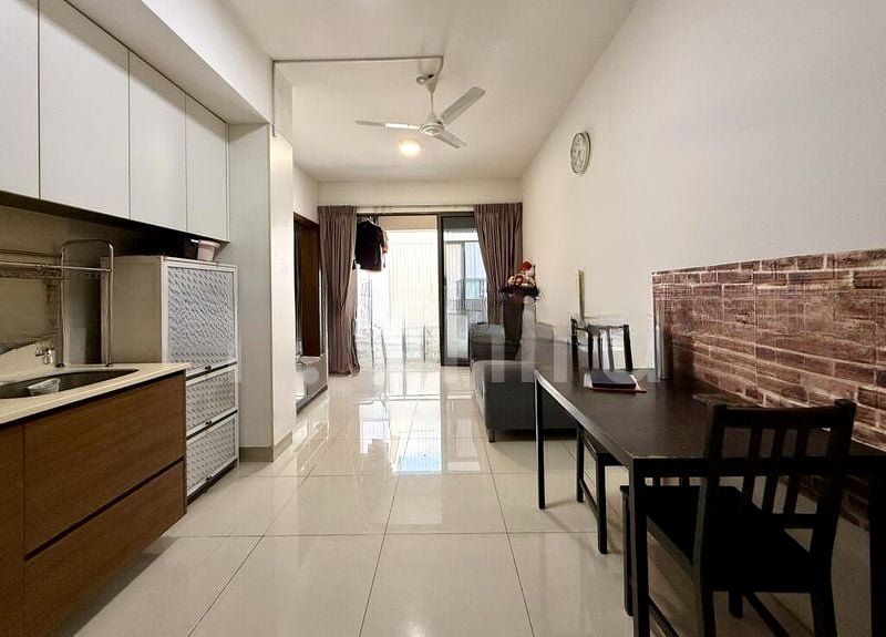 Step into a beautifully maintained unit at The Miltonia Residences, where modern minimalist design meets functional living. The open-concept living room invites you in with large format tiled flooring and a refreshing ceiling fan, seamlessly connecting to a private balcony that offers a tranquil outdoor escape. The subtle brick-patterned accent wall in the dining area adds a touch of character, while natural light filters through, creating a warm and inviting ambiance.