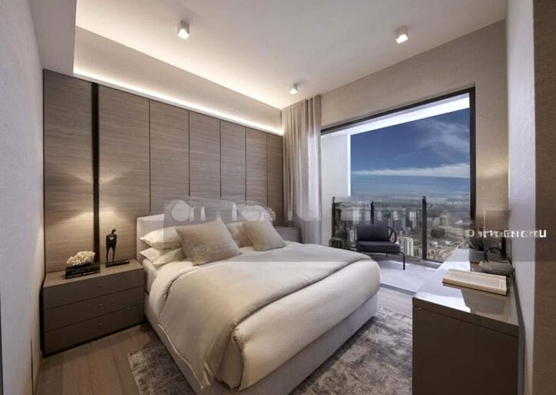 This efficient 2-bedroom, 1-bathroom layout is thoughtfully crafted for both comfort and style. The master bedroom boasts an en-suite bathroom and a striking wood-paneled feature wall, complemented by cove lighting that enhances the serene atmosphere. The linear kitchen is equipped with integrated appliances and sleek white cabinetry, making it perfect for culinary enthusiasts. The dedicated dining area, adorned with marble flooring and a black feature wall, is ideal for entertaining guests.