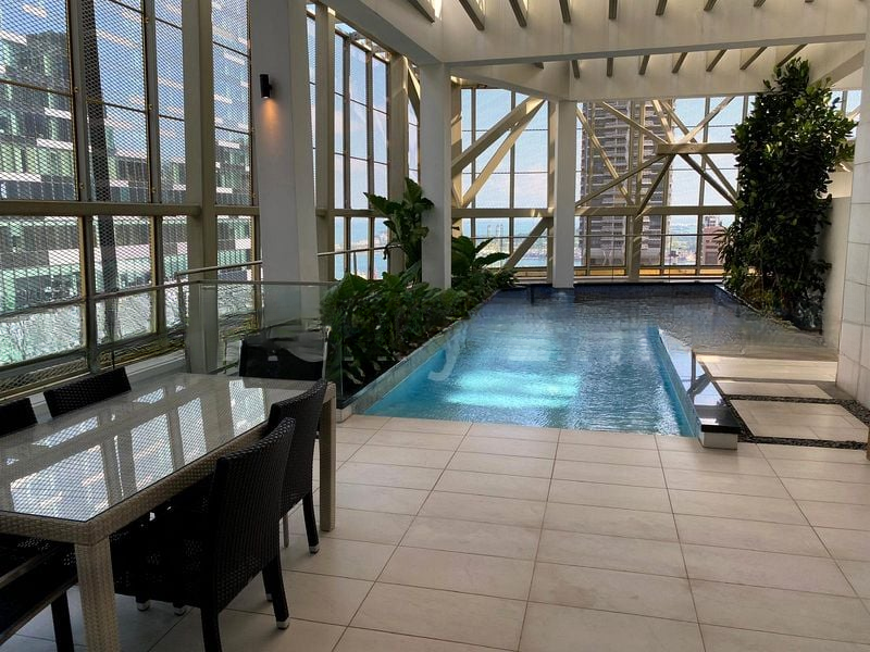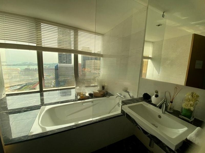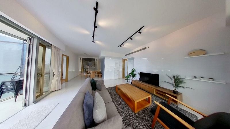This well-maintained 4-bedroom, 3-bathroom unit boasts a thoughtful layout designed for both comfort and style. The master bathroom features stunning black marble flooring, a double vanity, and a bathtub positioned perfectly by the window for an indulgent soak with a view. The living room, adorned with modern furniture and wood flooring, seamlessly connects to the outdoor seating area on the balcony, making it ideal for entertaining or relaxing.