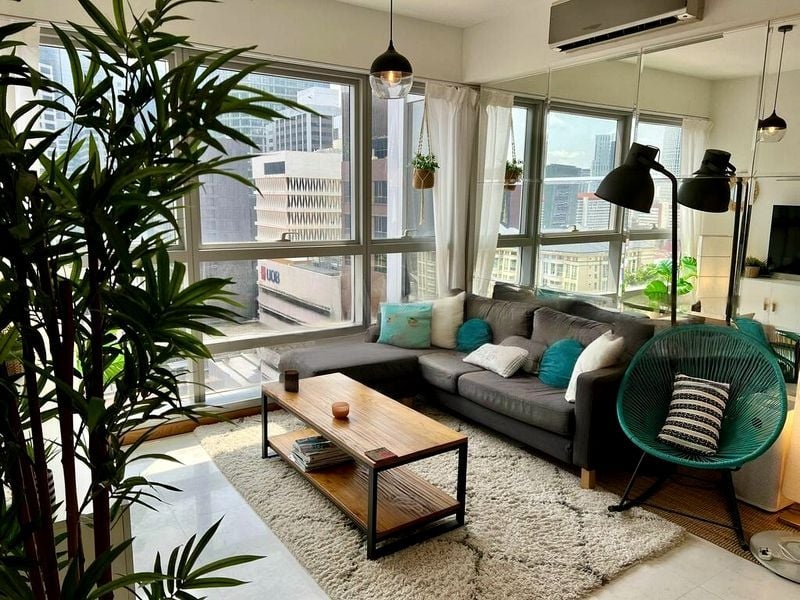 This well-maintained 1-bedroom condo features a minimalist bedroom with floor-to-ceiling windows, offering a serene retreat with stunning views. The modern kitchenette is equipped with dark wood grain cabinets and sleek black stone countertops, seamlessly integrating functionality with style. The open layout enhances the cozy ambiance, making it perfect for contemporary living.
