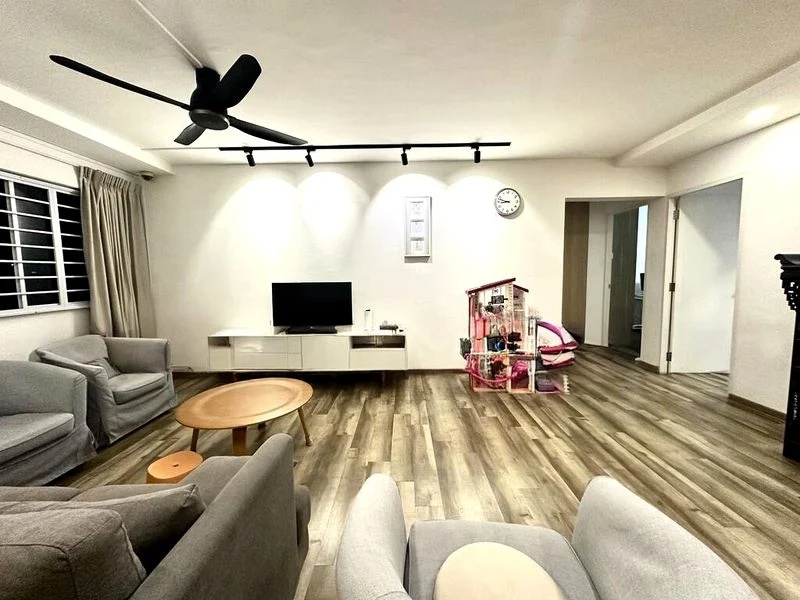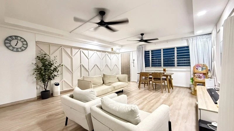 Step into a beautifully renovated space where modern industrial charm meets abundant natural light. The open-concept dining area, adorned with striking concrete-look feature walls and modern pendant lighting, invites you to unwind and entertain. Large windows in the bedroom frame views of neighboring HDB blocks, creating a warm and inviting atmosphere throughout.
