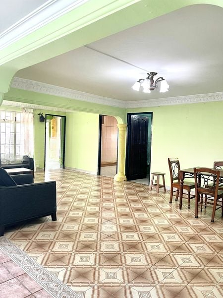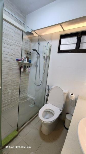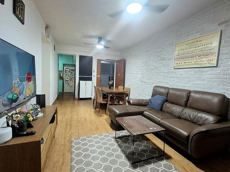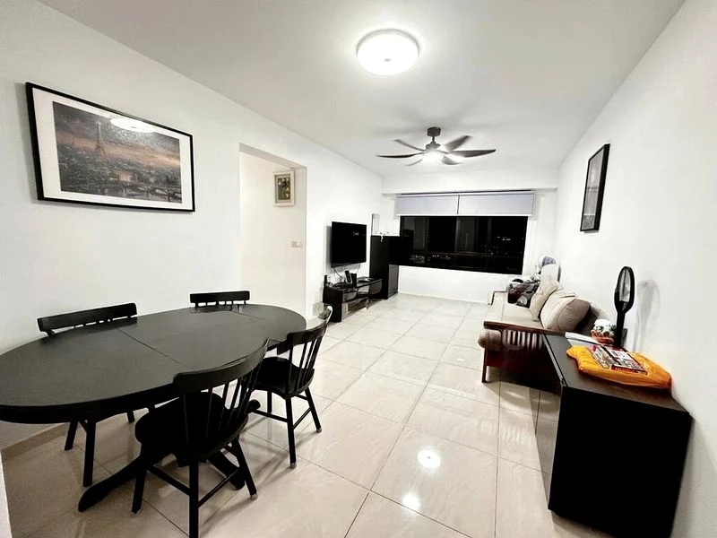 Step into a beautifully renovated 2-bedroom flat that exudes modern minimalist charm. As you enter, the bright and airy living room welcomes you with large windows framed by sleek black grilles, allowing natural light to dance across the white tiled flooring. The built-in TV console and L-shaped sofa create an inviting space perfect for relaxation, while the ceiling fan adds a touch of comfort.