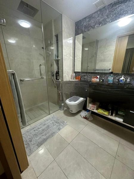 This fully-furnished 1-bedroom unit boasts a sleek kitchen with dark wood-grain cabinetry and integrated appliances, seamlessly flowing into the dining area with a chic glass-top table. The bedroom is a tranquil retreat, featuring a padded headboard and large windows that enhance the minimalist design. The bathroom is a luxurious haven with marble-clad walls and a glass shower enclosure, offering a spa-like experience at home.