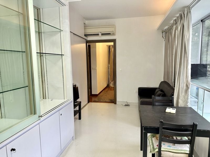 This well-maintained unit features a thoughtful layout with a cozy dining area and a compact dining table, ideal for intimate meals. The master bedroom is a tranquil retreat, complete with dark wood sliding wardrobes and wood flooring, while the modern bathroom impresses with its grey tiled walls, wall-hung toilet, and glass shower partition. Enjoy the convenience of built-in wardrobes in both bedrooms, maximizing space and functionality.