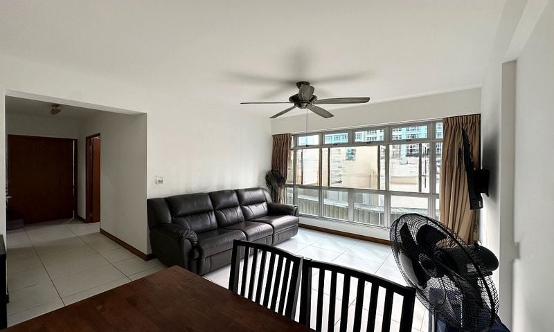 Step into this well-maintained 2-bedroom flat and be greeted by a sense of spaciousness and modernity. The large living room windows invite natural light, enhancing the clean ambiance while offering views of urban buildings and neighboring blocks. The functional layout is accentuated by tiled flooring and a stylish black leather sofa, creating a welcoming atmosphere for relaxation and entertainment.
