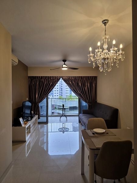 Step into this beautifully renovated HDB flat and be greeted by a warm, inviting atmosphere. The modern finishes, highlighted by a stunning crystal chandelier, create an elegant yet cozy living space. Natural light filters through the open-plan layout, enhancing the charm of the living room that seamlessly connects to a private balcony, offering urban views of the surrounding neighborhood.