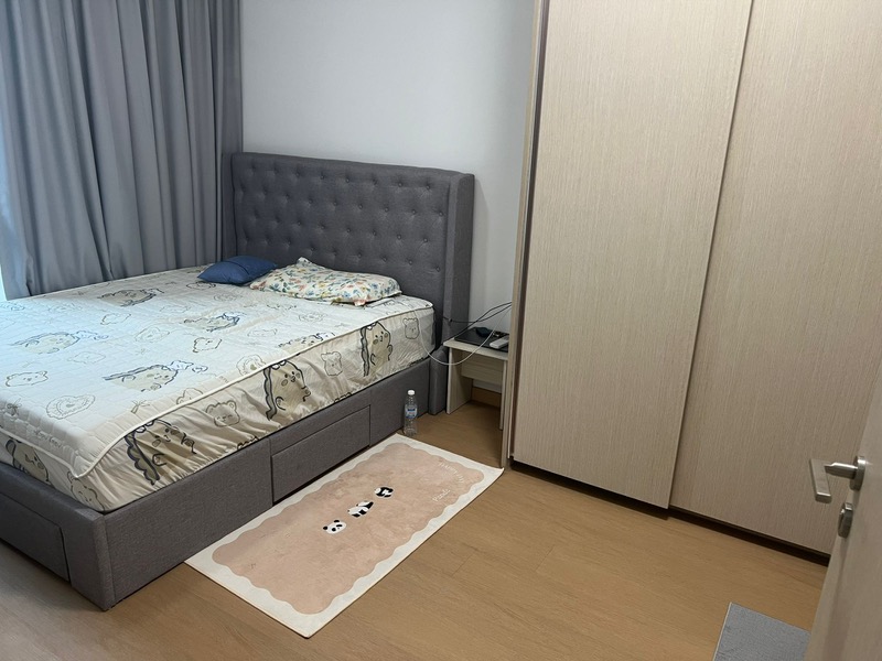 This efficient 2-bedroom, 2-bathroom unit features an open-concept layout that seamlessly connects the living, dining, and kitchen areas. The modern kitchen boasts sleek white cabinetry and countertops, equipped with an induction cooktop, perfect for culinary enthusiasts. The master bedroom comes with a private balcony and built-in wardrobe, while the second bedroom also enjoys large windows and wood-look flooring, adding warmth to the space.