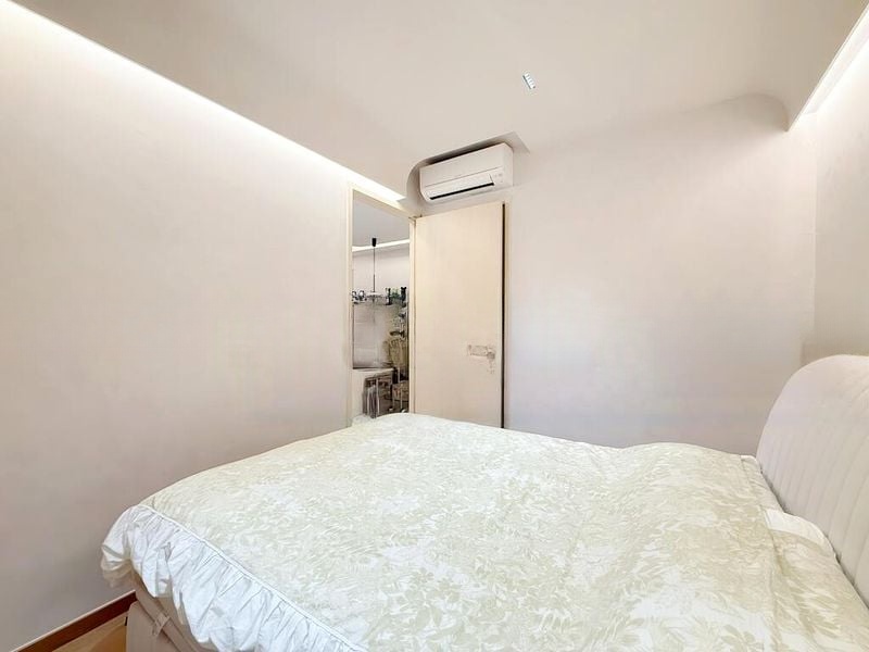 Step into a world of modern elegance as you enter this beautifully designed 2-bedroom unit at The Florence Residences. The open-concept living room greets you with coved ceiling lighting that casts a warm glow over the minimalist furniture and pristine white floor tiles, creating an inviting ambiance. Large windows in the bedroom allow natural light to filter through sheer curtains, enhancing the serene atmosphere of this well-maintained home.