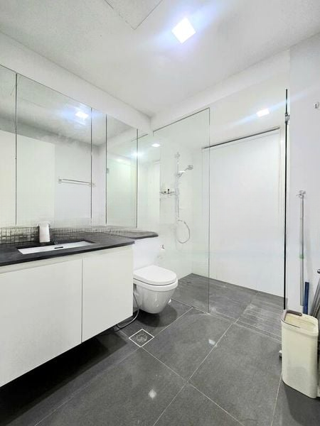 This well-maintained 1-bedroom unit features a dedicated exercise/study area, perfect for balancing work and wellness. The living room is designed for comfort with a sleek black leather sofa and a stylish round coffee table, while the contemporary bathroom boasts dark grey floor tiles and a glass shower partition. Enjoy the seamless flow from the indoor spaces to the outdoor balcony, complete with dark wood-look decking and an outdoor dining set.