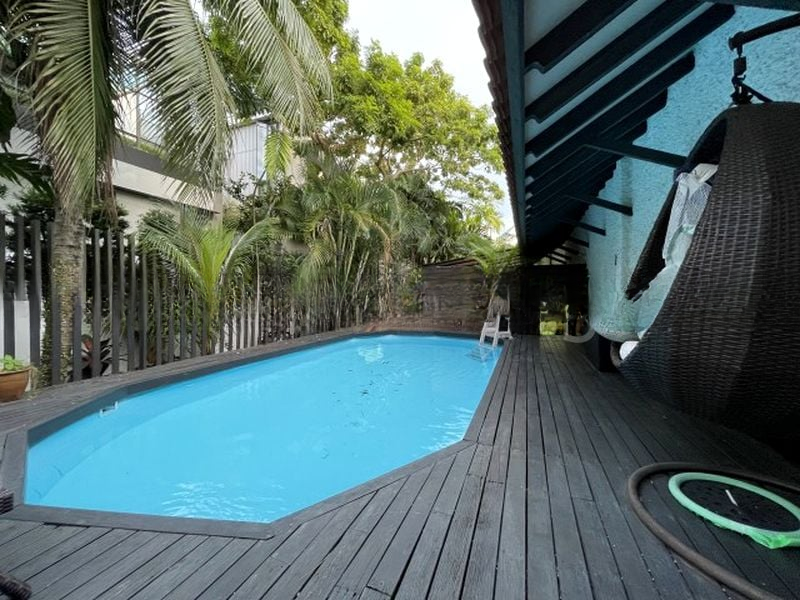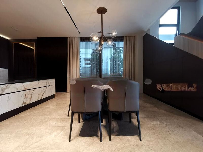 Step into a world of modern elegance as you enter this exquisite home, where abundant natural light floods through floor-to-ceiling glass windows, illuminating the polished marble flooring and the striking wooden slat feature wall. The ambiance is one of minimalist sophistication, perfectly complemented by views of the serene lap pool and lush greenery that beckon you to unwind.