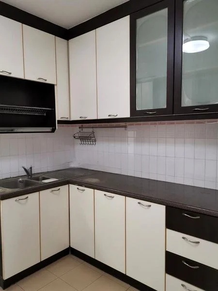 This unit boasts three spacious bedrooms, each thoughtfully designed for comfort. The updated kitchen features an L-shaped layout with elegant white cabinetry and a chic tiled backsplash, perfect for culinary enthusiasts. The dining area, adorned with terrazzo flooring, comfortably accommodates a six-seater wooden dining set, making it ideal for family gatherings.