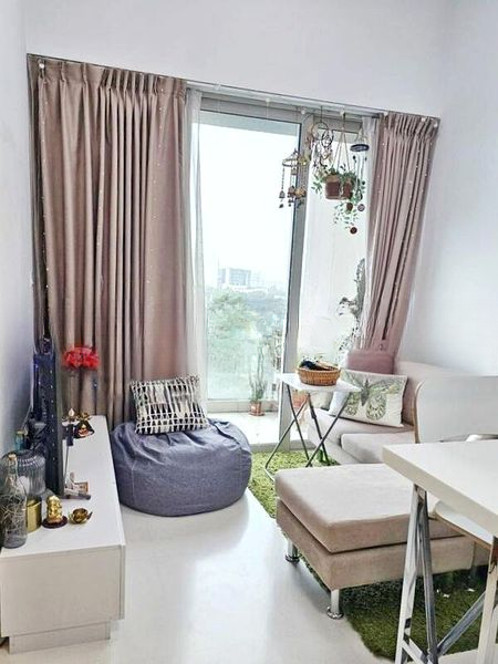 Step into a bright and airy sanctuary where floor-to-ceiling windows invite abundant natural light, illuminating the open-concept living space. The large balcony, adorned with artificial turf, offers a perfect spot to unwind while enjoying stunning views of the city skyline and surrounding greenery.