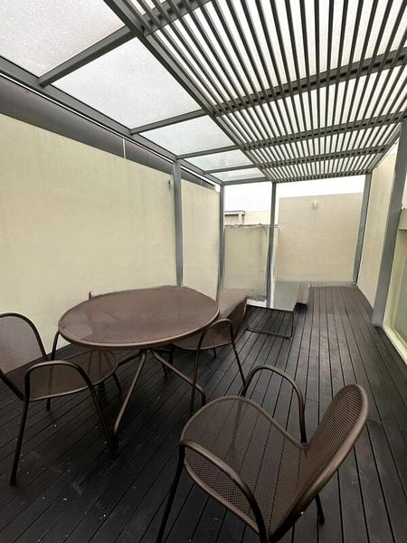 Step into a serene retreat where cozy ambiance meets functional design. The living area greets you with elegant marble-look flooring that reflects natural light, creating a warm and inviting atmosphere. Sliding doors lead to a charming balcony, offering a peaceful view of lush greenery, perfect for unwinding after a long day.