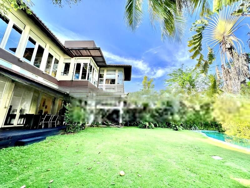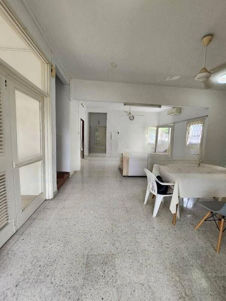 Step into a bright and airy sanctuary where the beauty of terrazzo flooring meets the lush greenery outside. The expansive living room, adorned with ceiling fans and split-unit air conditioning, invites natural light through sliding glass doors that seamlessly connect to your private garden. The ambiance is both welcoming and serene, perfect for relaxation or entertaining guests.