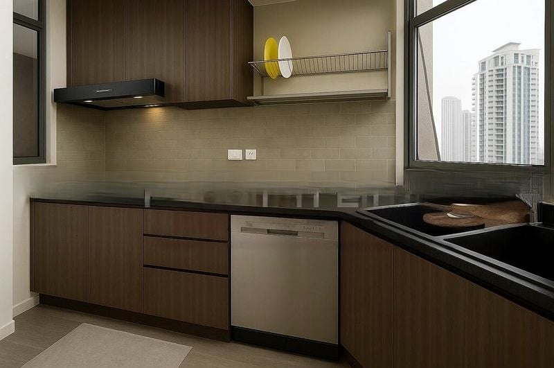 Step into a bright and airy split-level living area that captivates with its abundant natural light and stunning city skyline views. The marble flooring adds a touch of elegance, while large windows invite the vibrant urban landscape into your home, creating a welcoming ambiance that feels both spacious and inviting.