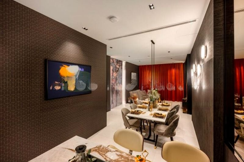 Step into a world of elegance as you enter this brand-new designer home, where luxurious finishes and moody ambiance greet you. The marble-patterned feature walls and a stunning bubble chandelier create a captivating visual experience, complemented by the soft glow of integrated lighting and floor-to-ceiling curtains that frame the space beautifully.