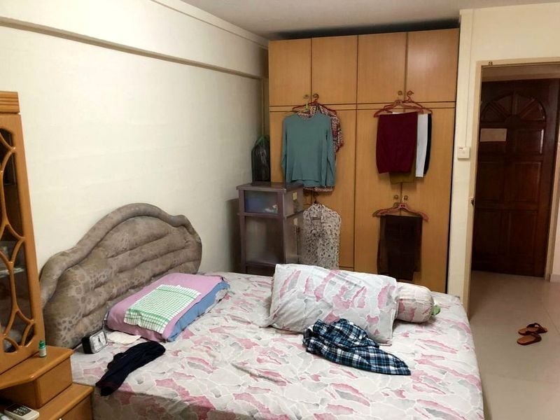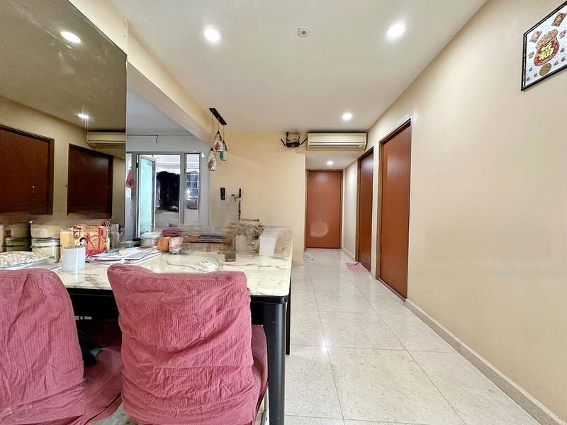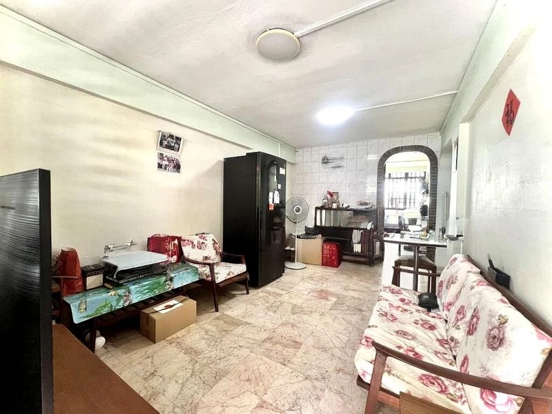 Step into this charming 2-bedroom flat and feel the warmth of its basic yet functional ambiance. The broken marble flooring underfoot complements the moderate natural light streaming in through the large windows, offering a glimpse of urban surroundings. The arched doorway invites you into a cozy living room, where the yellow sofa adds a touch of cheerfulness to the space.