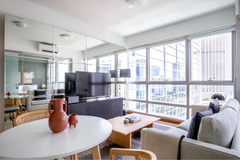 Step into a bright and airy sanctuary at The Clift, where abundant natural light floods through floor-to-ceiling windows, showcasing breathtaking views of the city skyline. The open-concept living area, adorned with a sleek black leather sofa, invites you to unwind in style, while the glass-partitioned bedroom offers a modern touch that enhances the overall ambiance.