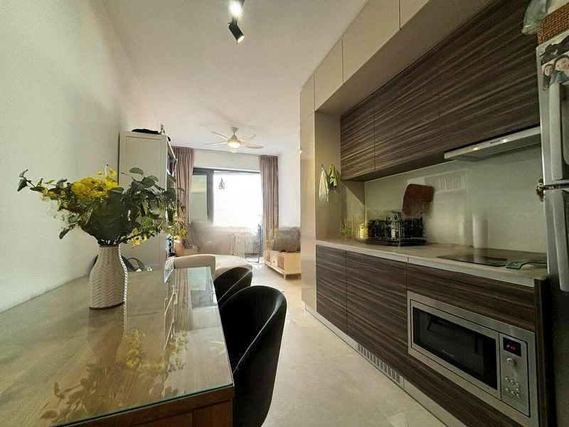 This thoughtfully designed unit features an open-concept kitchen and dining area with wood-look laminate cabinetry and modern ring lighting, perfect for entertaining. The compact living room is equipped with wall-mounted air conditioning and stylish furniture, while the bedroom boasts floor-to-ceiling sliding glass doors and a glossy built-in wardrobe. Enjoy the luxury of a glass shower partition in the bathroom, complemented by a wall-mounted vanity with ample storage.
