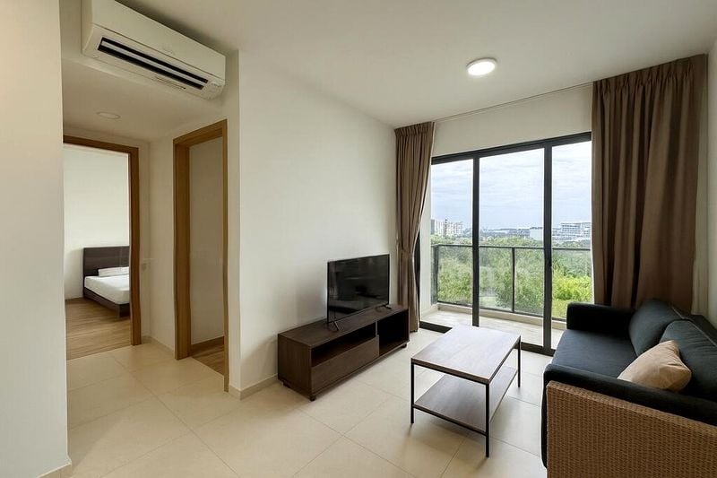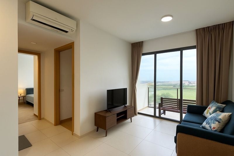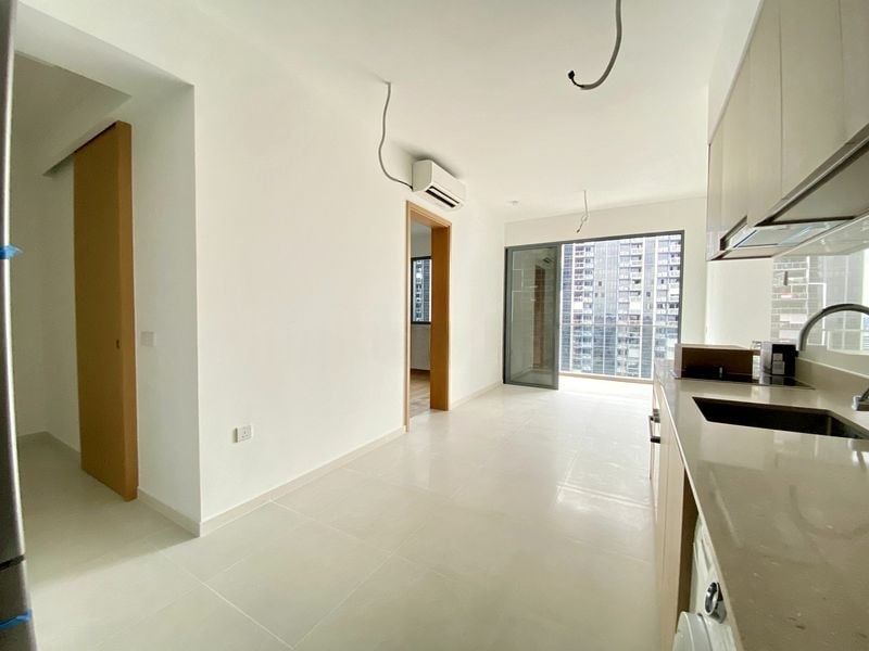 Step into this brand-new 3-bedroom unit at Twin Vew and be greeted by an airy living space that exudes modern elegance. The abundant natural light streams through large windows, illuminating the sleek tiled flooring and enhancing the minimalist ambiance. Enjoy serene residential views framed by sheer and blackout curtains, creating a perfect blend of comfort and style.