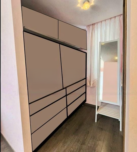 This efficient 2-bedroom layout features standout elements such as a stylish kitchen island with dark grey cabinetry, a built-in oven, and a separate wet kitchen area for culinary enthusiasts. The master bedroom boasts pink accent walls and an en-suite bathroom with a glass shower partition, while the dressing room offers a spacious walk-in wardrobe complete with an ornate vanity table. Every detail has been thoughtfully curated to enhance both functionality and aesthetics.