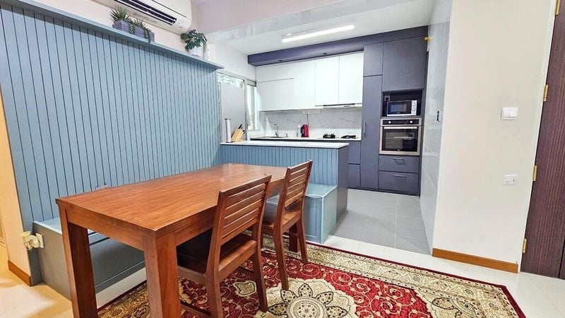 Step into a world of modern elegance as you enter this well-maintained 5-room flat at 323D Sumang Walk. The abundant natural light floods the open living space, highlighting the bold blue cabinetry and cove lighting that create a vibrant ambiance. Large windows frame urban views, while a striking mirror wall in the dining area enhances the sense of space and sophistication.