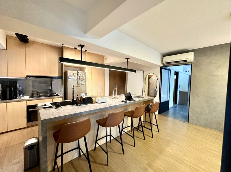 Step into this beautifully renovated 3-bedroom flat, where cozy warmth meets modern elegance. The open concept living area invites natural light, highlighting the marble-look countertops and dual-tone cabinetry in the kitchen. An airplane-themed ceiling light adds a whimsical touch, while the views of surrounding residential buildings create a serene urban backdrop.