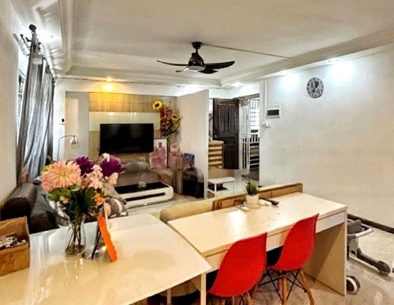 Step into a warm and inviting atmosphere where abundant natural light floods the spacious living area, accentuating the cozy ambiance of this well-maintained 3-bedroom flat. The large L-shaped leather sofa and study nook create a perfect space for relaxation and productivity, while the false ceilings with recessed lighting add a modern touch. Enjoy urban views from the large windows, complemented by tasteful curtains that enhance the overall aesthetic.