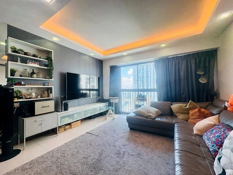 This unit boasts a spacious layout, with a comfortable living room that opens up to an urban view through sliding glass doors. Each bedroom is equipped with built-in wardrobes, ensuring ample storage while maintaining a clean and uncluttered look. The multi-purpose room offers versatility, perfect for a home office or additional guest space, all adorned with tasteful finishes and split-unit air conditioning for your comfort.