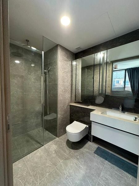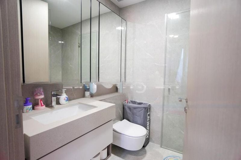 This well-maintained 2-bedroom, 2-bathroom unit boasts standout features such as wall-hung toilets, sleek glass shower partitions, and built-in wardrobes that maximize storage. The spacious layout includes a cozy bedroom with light wood-look flooring and pink accent walls, while the contemporary bathroom features an integrated sink vanity and a large mirror cabinet, adding a touch of luxury to your daily routine.