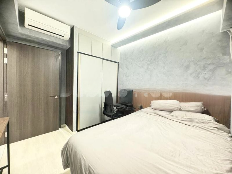 Step into a sanctuary of modern minimalist design at Riverfront Residences, where you are greeted by a stunning grey textured feature wall and an abundance of natural light filtering through large floor-to-ceiling windows. The ambiance is elevated by track lighting and a seamless connection to the balcony, offering serene views of lush greenery that invite tranquility into your living space.